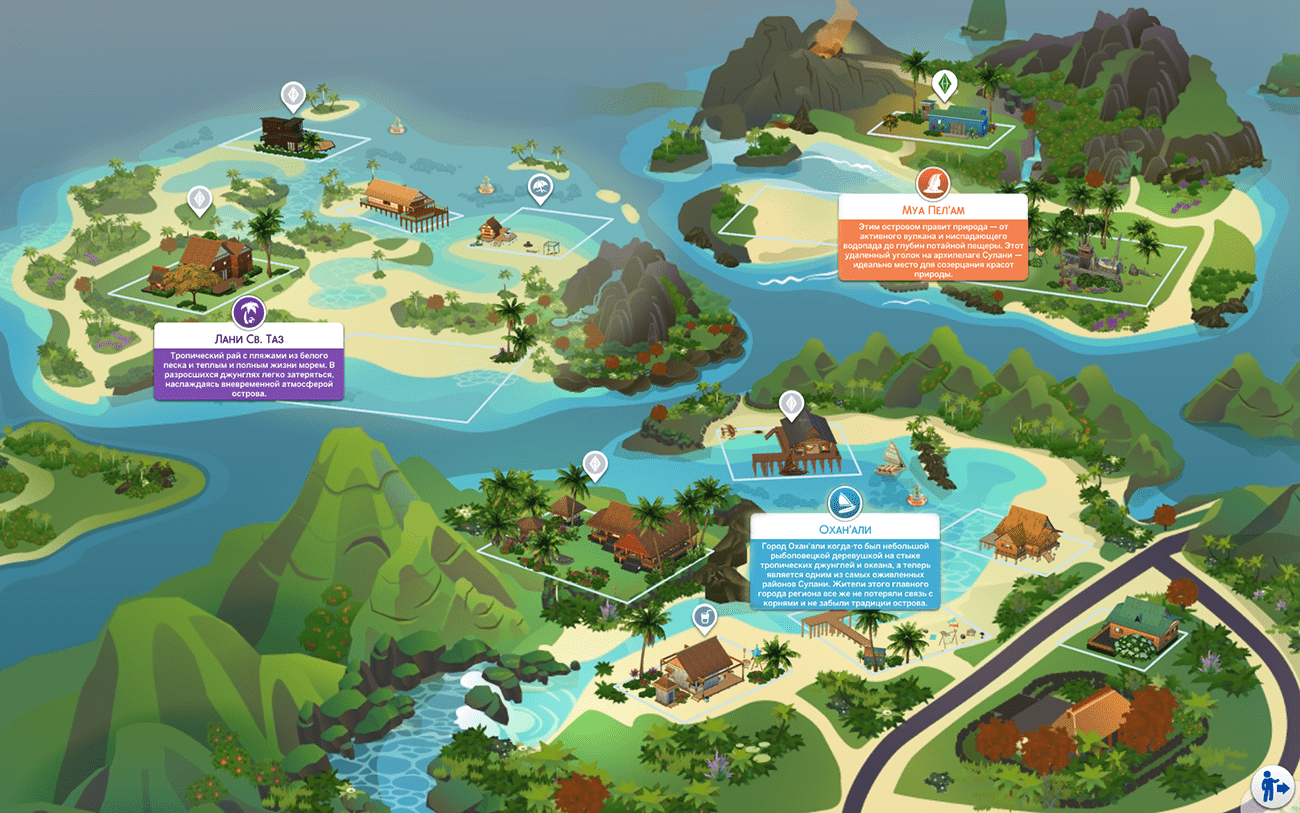 Сулани, так называется новый созданный разработчиками мир. Это не просто курортный городок, сюда можно переехать и остаться здесь жить. Архипелаг разделен на 3 района (Лани Св. Таз, Муа Пел’ам, Охан’али) и имеет 14 жилых участков, которые открывают новые возможности во вселенной The Sims.