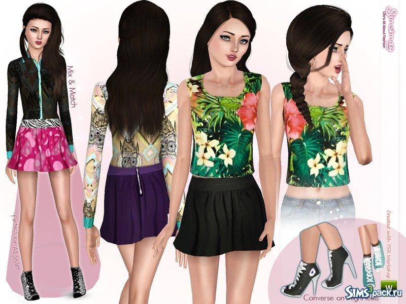Этот поистине универсальный набор включает в себя легкую майку- безрукавку, жакет и юбку средней длинны, присобраную в поясе на широкую резику. В дополнение к комплекту идут оригинальные туфли со шнуровкой на невысокой шпильке.