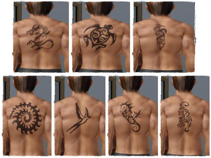 Набор однотонных татуировок в стиле трайбл. Подойдут и мужским персонажам и женским. В наборе следующие тату: птица, тигр, спираль (похоже на символ “роя” из старкрафта), черепаха, морской конек, две татухи с драконом. Всего семь штук.
