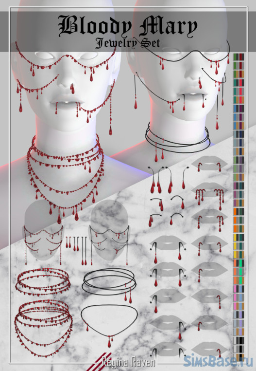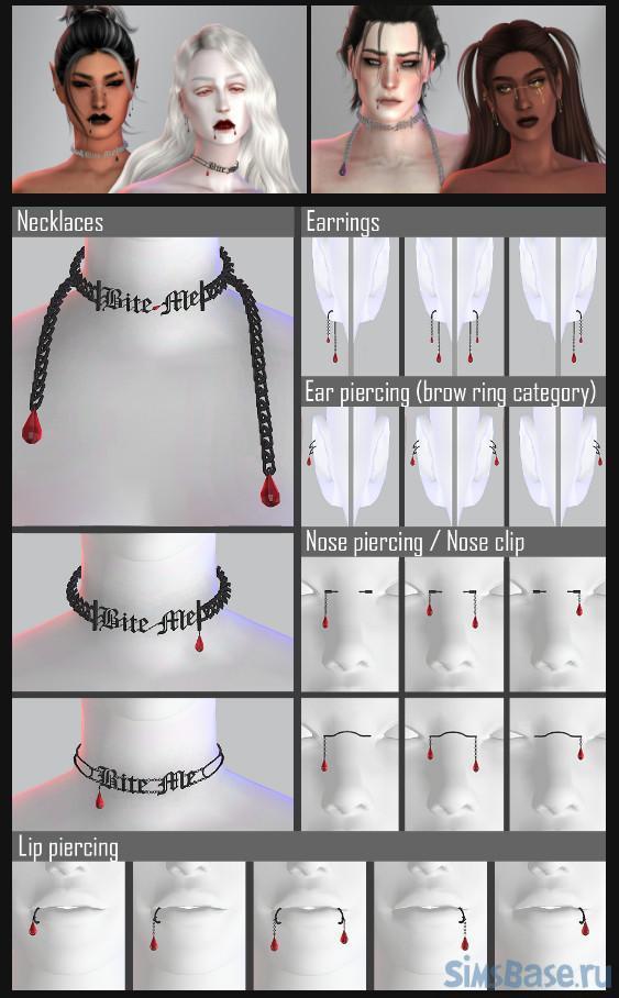 Коллекция включает наборы пирсинга и украшений для лица, которые отлично подойдут подросткам и молодым симам. Подтеки с кровью, цепочки, проколоты ноздри, губы, уши, есть чокеры, бусы, и многое другое. Все украшения имеют множественные цветовые варианты и подходят как для мужчин, так и женщин.
