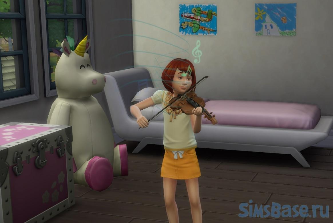 - Все детские предметы, стол для творчества, скрипка , стартовый набор для юных волшебников, книжная полка, ящик для игрушек, письменный стол со стулом и настольной лампой, перекладины для обезьян, шахматная доска и аквариум.