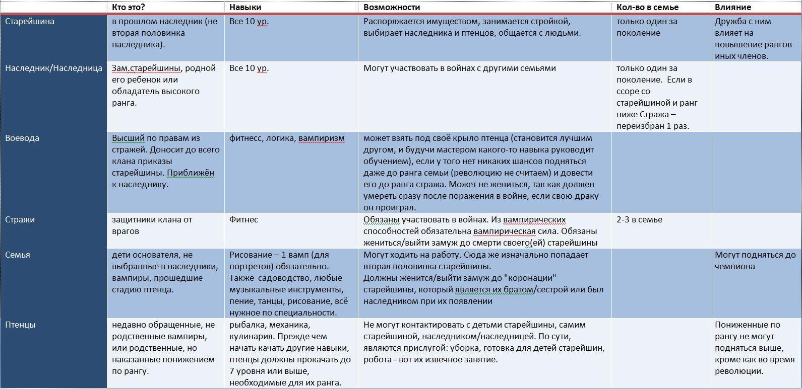 - Если член клана имеет ур. навыков (логика, фитнес , обаяние) выше старейшины. Тогда старейшина с друзьями и наследником выселяются на др. участок . Лучший вамп становится новым старейшиной и выбирает наследника на ближайшем заседании совета.