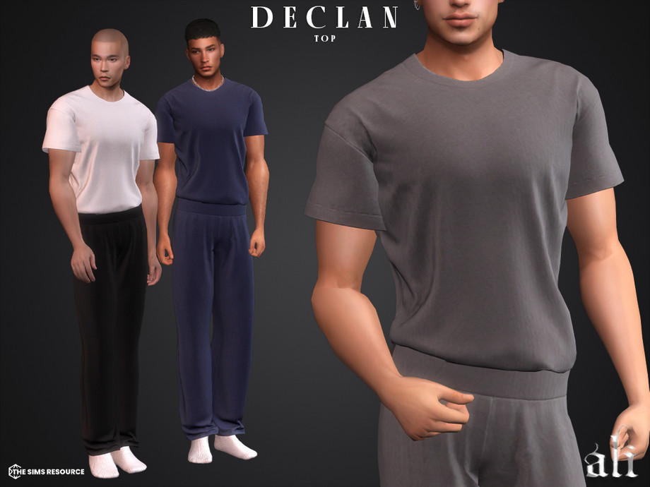 DECLAN top — это элегантная заправленная футболка (tucked-in T-shirt), также созданная на новом меше с HQ-текстурами. В наборе представлено 10 свотчей: классические однотонные цвета и более интересные варианты с оттенками и принтами. Топ отлично смотрится как с брюками DECLAN, так и с джинсами или шортами, подчёркивая аккуратный и ухоженный стиль симов.