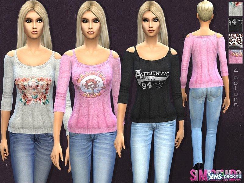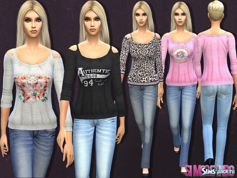 Набор современной женской казуальной одежды. Включает в себя четыре различных кофты с широким вырезом и открытыми плечами, украшенные стильными элементами (принты, природные узоры, растительные элементы), и джинсы пяти различных цветовых вариаций.