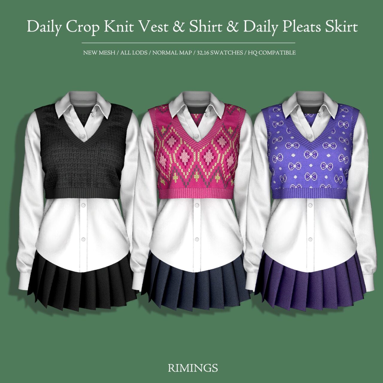 Добавьте в гардероб ваших симов стильный и уютный повседневный образ от RIMINGS! Наряд Knit Vest & Shirt & Skirt — это идеальное сочетание для осени и прохладных дней: укороченная вязаная жилетка, аккуратная рубашка и женственная юбка-плиссе. Комплект выглядит нежно, современно и очень элегантно — отличный выбор для студенток, офисных леди или просто любительниц casual-шика.