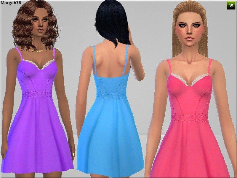 Милое платье на лямках с расклешенной книзу юбкой и кружевными оборками на бюсте. Пояс украшен блестками. прекрасно сочетается с высоким каблуком или блестящими туфельками. Приятнее всего будет смотреться на подростках, но доступно для всех взрослых персонажей.