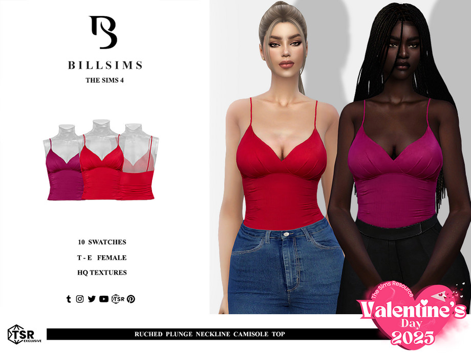 Добавьте элегантности и женственности гардеробу ваших пожилых сим-дам с новой майкой на бретельках от Bill Sims! Эта изящная блузка с глубоким V-образным вырезом и драпировкой (ручингом) по боковым швам и спинке выполнена из мягкой, струящейся ткани, которая прекрасно ложится и подчёркивает силуэт. Глубокий вырез придаёт нотку сексуальности, но остаётся в рамках утончённого стиля, идеально подходящего зрелым симам.