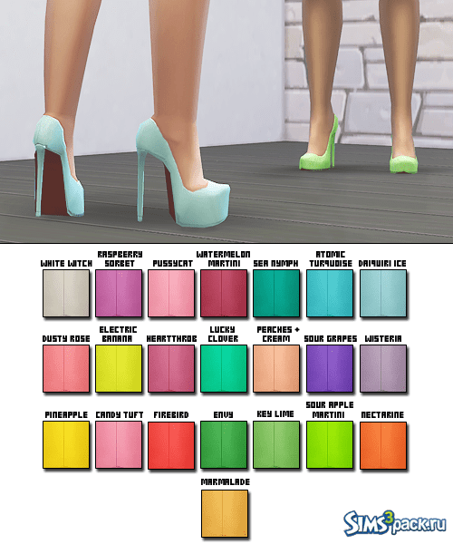 Яркие туфли на очень высоком каблуке. Благодаря необычным цветам (голубой, зеленый и так далее) и действительно высокой шпильке достаточно эффектны, чтобы привлекать внимание и подходить для практически любой ситуации – от веселья вместе с подружками и до коктейльной вечеринки.