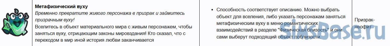 Это уморительно, так как душ — это обычное место для вуху. Сила призрака Метафизический вуху разблокируется сразу после того, как вы станете призраком, давая даже новым призракам шанс пошалить с ней. Она стоит всего одно очко оккультной силы и не считается ни хорошей, ни плохой. Таким образом, как добрые, так и злые призраки могут делать вуху.
