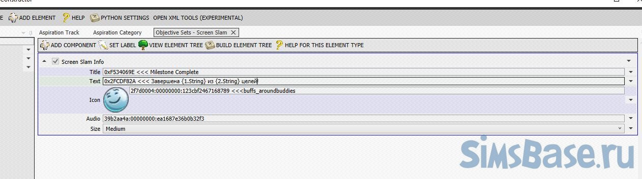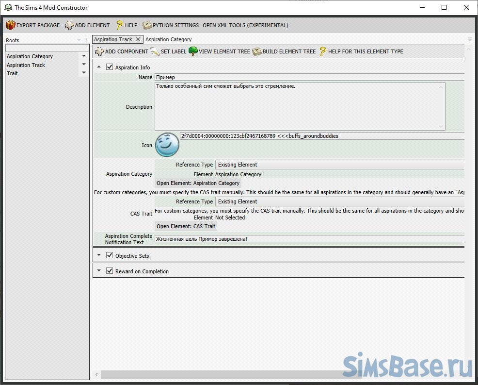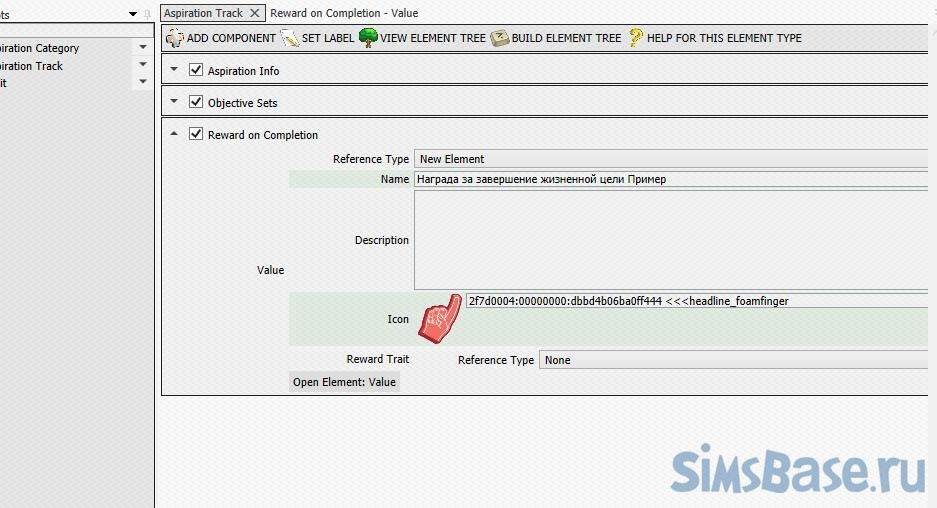 Переходим к Aspiration Track (этапам) и добавляем компоненты (Add Component): Aspiration Info (общая информация о ЖЦ), Objective Sets (задачи для каждого этапа), Reward on Completion (награда за завершение).