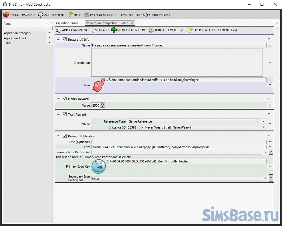 Reward Ui Info – общая информация заполнилась уже автоматически. Money Reward (денежное вознаграждение) выбирайте любое. Мы решили, что 2500 симолеонов достаточно.