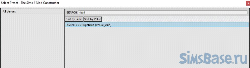 Для параметра Venue Type (Тип события) нужно усыновить Inside (внутри), что логично, ибо как только сим придет в Ночной клуб, он и получит бафф, а не у себя дома или в кафе. Нажимаем на стрелочке, выбираем Select Preset. В поиске для Ночного клуба один вариант, его и выбираем.