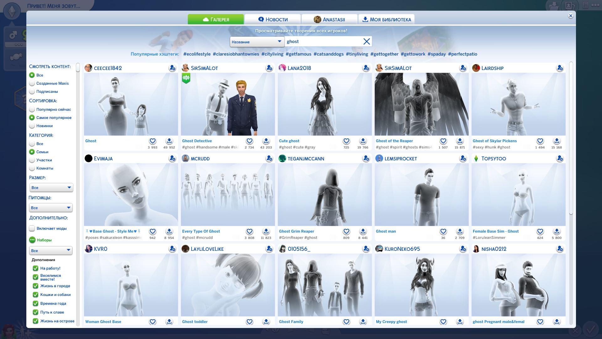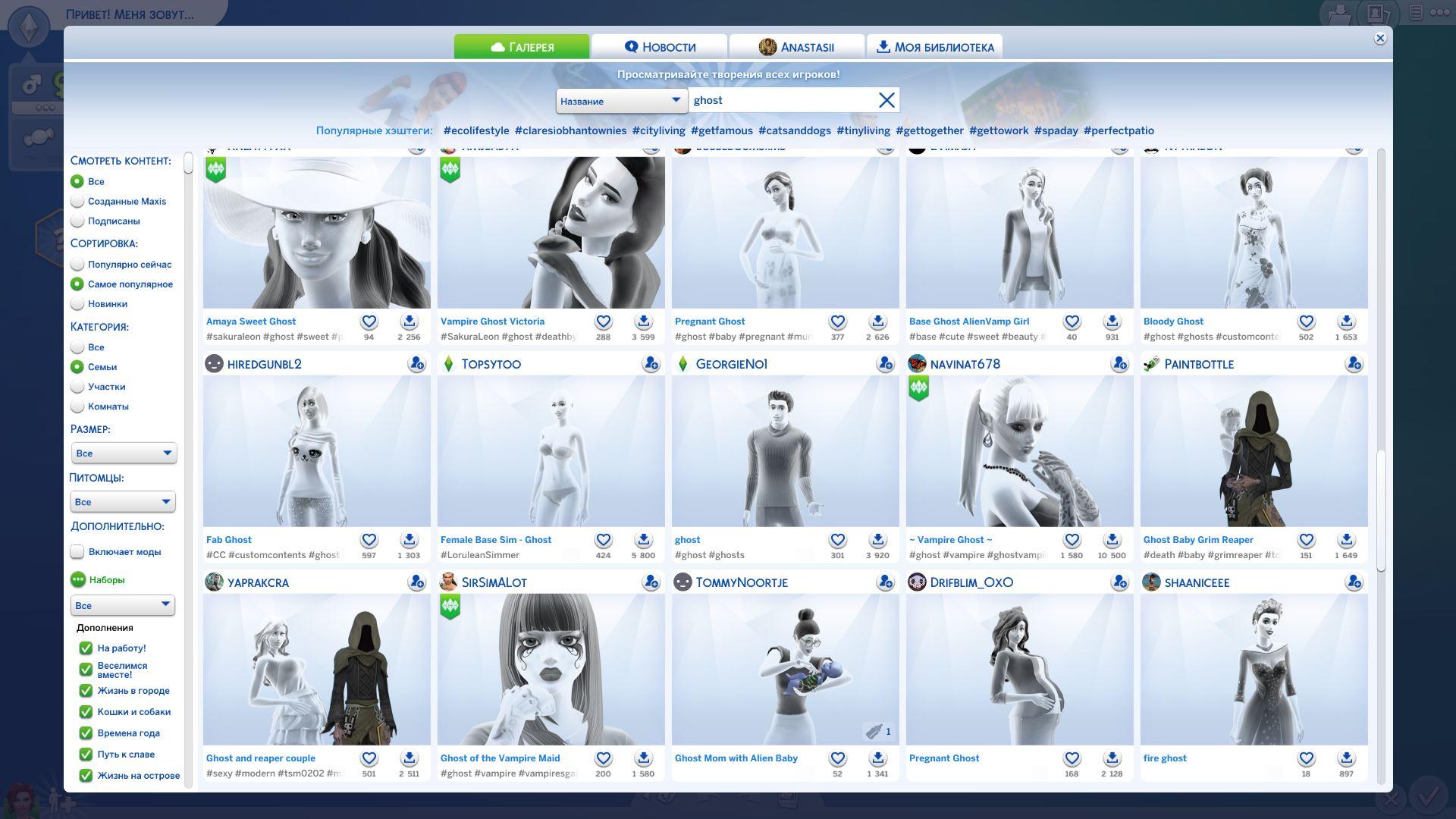 Открыв CAS, используйте поиск в Галерее по запросам: ghost, призрак , привидение. Вы получите доступ к буквально тысячам игровых персонажей-призраков, которых затем можно редактировать в CAS.