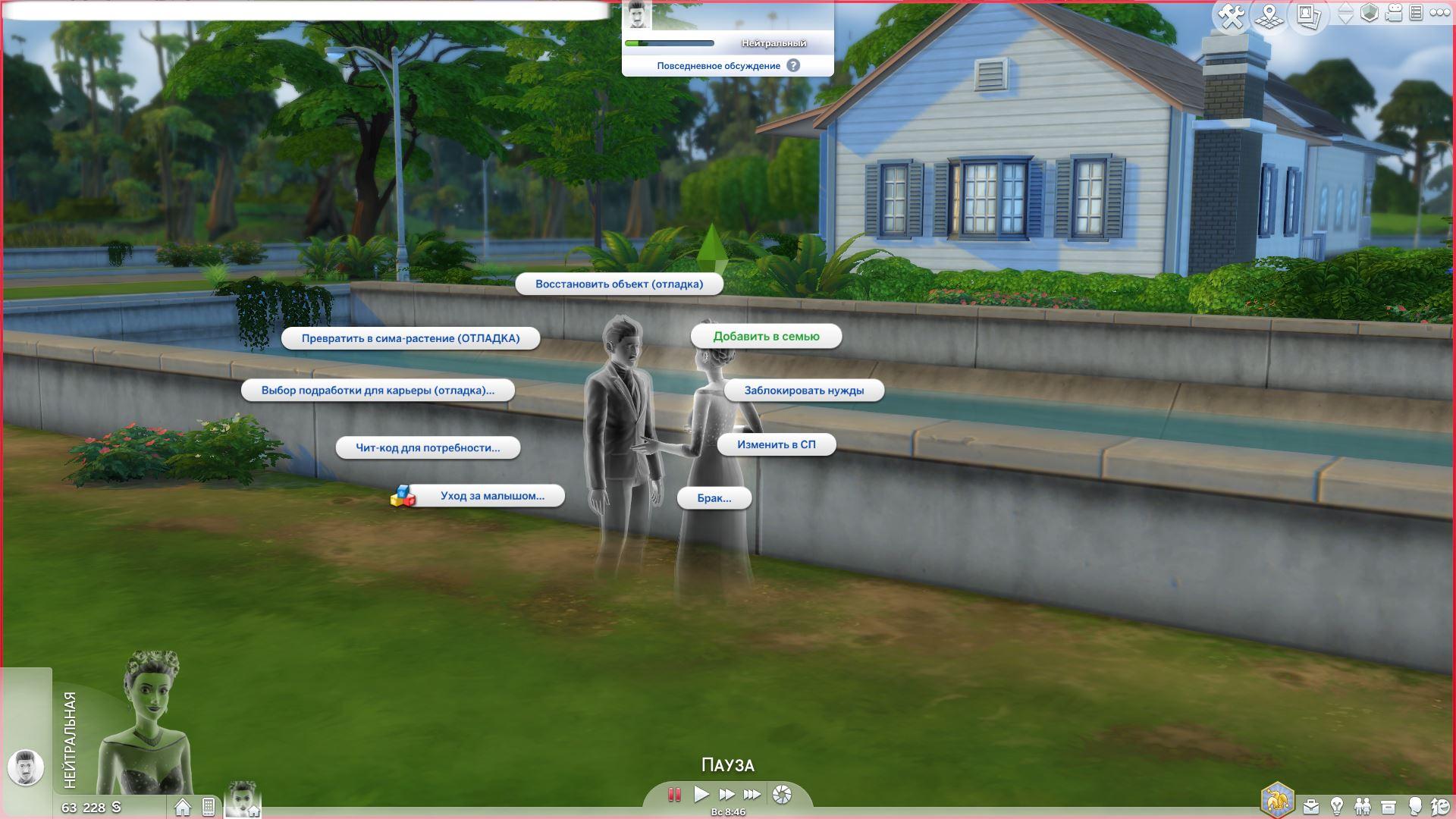 Добавление призрака NPC в семью – если вы хотите быстро добавить существующего призрака NPC в дом вашего сима, нажмите Shift + клик на призраке и выберите опцию «Добавить в семью» во всплывающем меню отладки. Это работает так же, как социальное взаимодействие «Добавить в семью », так как оно сразу делает персонажа играбельным в вашей семье и не несет в себе потенциального отказа.