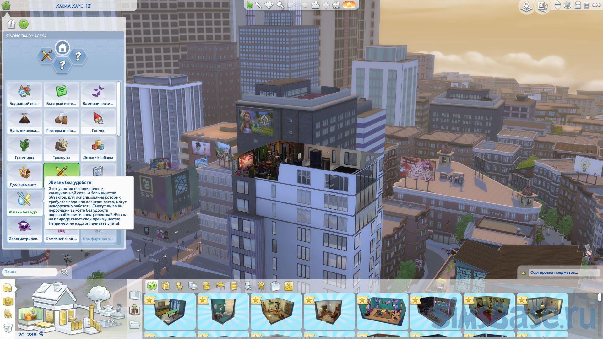 Чтобы официально сделать дом вашего сима отключённым от коммунальных служб (КС), вам нужно добавить свойство участка «Жизнь без удобств». Это можно сделать, перейдя в режим строительства и перейдя к значку домика и вопросительного знака в верхнем левом углу экрана. Вы увидите все доступные вам характеристики участка, и они будут расположены в алфавитном порядке.