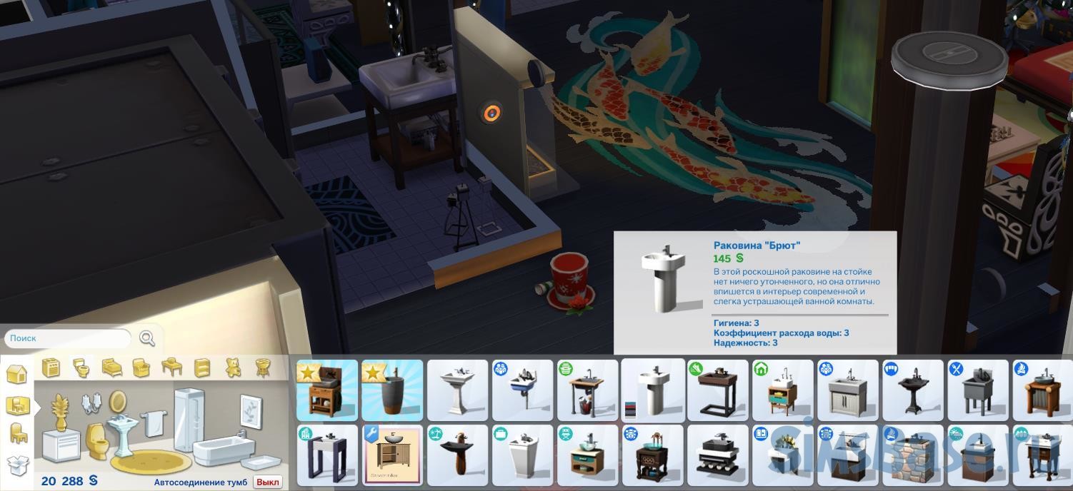 В ванной есть 3 необходимых предмета: раковина, унитаз и душ/ванна. Вам нужно убедиться, что вы выбираете предметы, которые могут функционировать без подключения к КС, из категории «Жизнь без удобств» в режиме строительства . Эти предметы будут работать немного иначе, чем обычный набор для ванной.