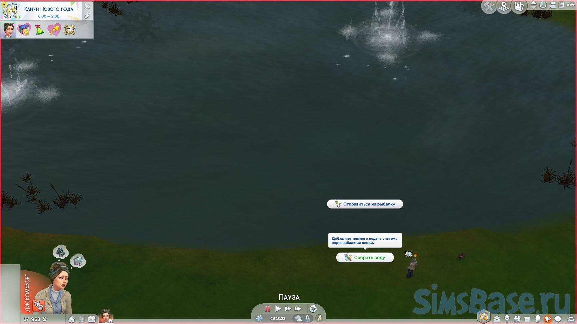Если вы хотите, чтобы вашему симу было доступно немного воды, вы можете получить её, если соберёте сами. Вы можете пойти в любое место для рыбалки (пруд, озерцо в любом регионе) или в любое место для плавания (например, к океану Сулани) и выбрать «Собрать воду ». Эта вода позволит вам регулярно принимать душ или ванну, пользоваться туалетом или использовать раковину в обычном режиме.