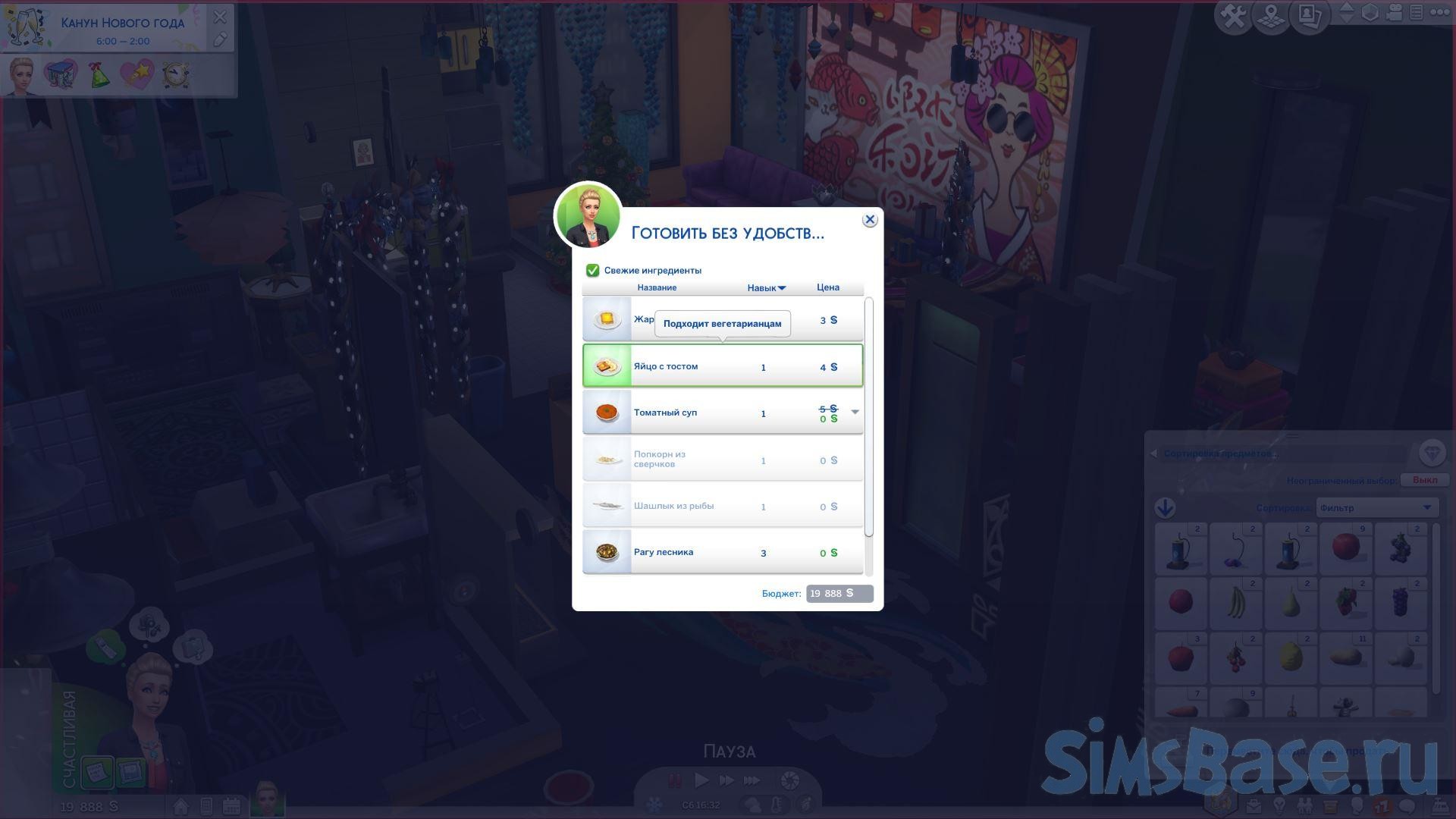 На кухне у вас может быть холодильник и плита , если вы выберете их из категории «Жизнь без удобств». Однако у них будет другой функционал. Во-первых, теперь ваши варианты питания сильно ограничены. Когда вы нажмёте на плиту, вы увидите действие «Готовить без удобств» и некоторое количество блюд. Вы также можете приготовить любой салат или фруктовый салат, поскольку для их приготовления не требуется электричество.