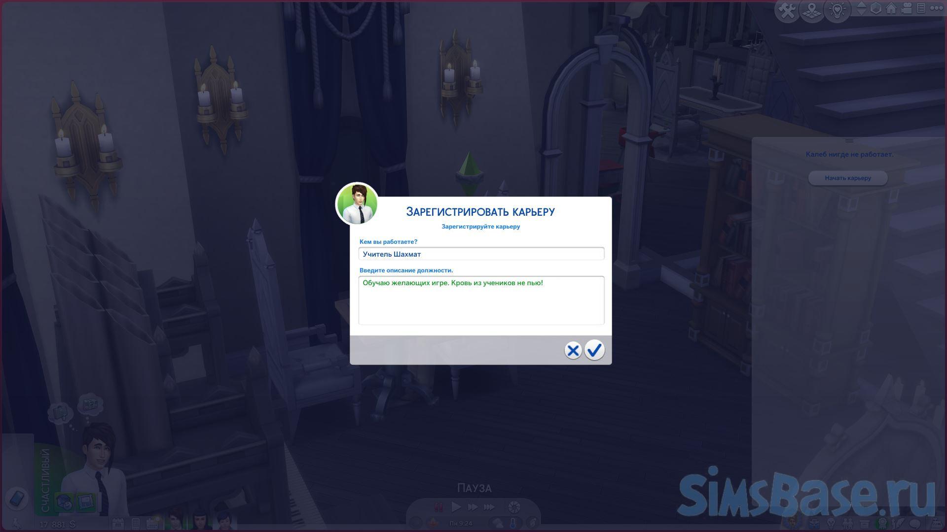 - Укажите карьеру, выбранную вашим симом, и краткое описание. Здесь нет ограничений по содержанию, но есть ограничения по количеству символов. Воспринимайте это как короткий пост в социальной сети о вашей новой работе.