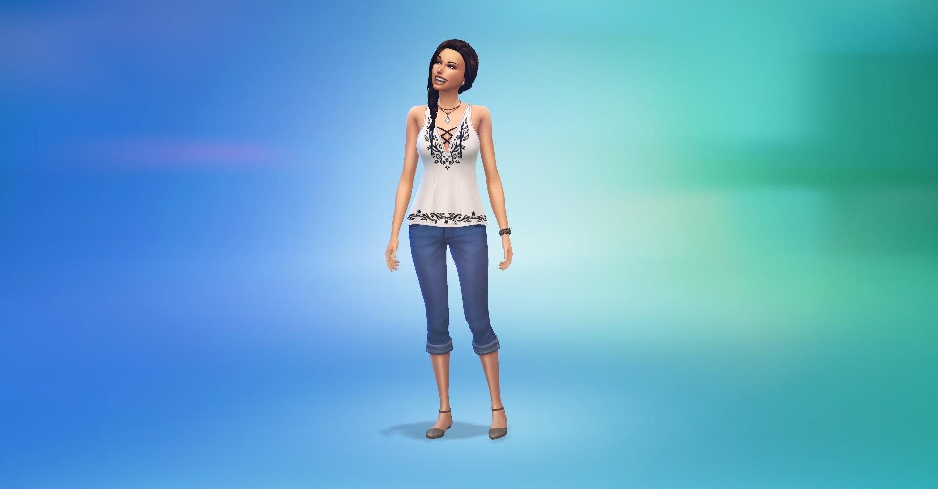 Теперь что касается одежды, художники много двигают руками и всегда стоят на ногах (вы когда-нибудь пробовали рисовать? Это так утомительно!), поэтому ей понадобится удобный наряд, который позволит ей легко передвигаться. Представляя себя в образе художника , мы подумали, что она хотела бы носить классный дизайн/принт на своей одежде , поэтому есть для нее вот такой топик-маечка. После выбора простых, но, казалось бы, удобных туфель, она выглядела немного в стиле хиппи /хобо, так что это помогает выбрать аксессуары . Кроме того, зная, что она скоро забеременеет (обычно это у симов происходит быстро как-то), мы решили, что этот образ будет идеально подходить на время ожидания первенца и к большому животику. Видите, как все взаимосвязано?