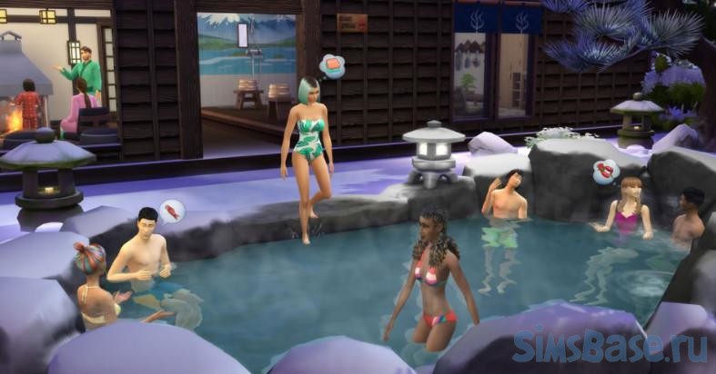 Симы могут использовать раздевалки, а знаки заставляют их самостоятельно принимать душ, прежде чем они войдут в горячие источники. Хотя мы можем понять, что рейтинг игры, возможно, повлиял на решение отказаться от традиционной наготы при купании, мы не совсем понимаем, почему симы могут там заниматься Вуху.