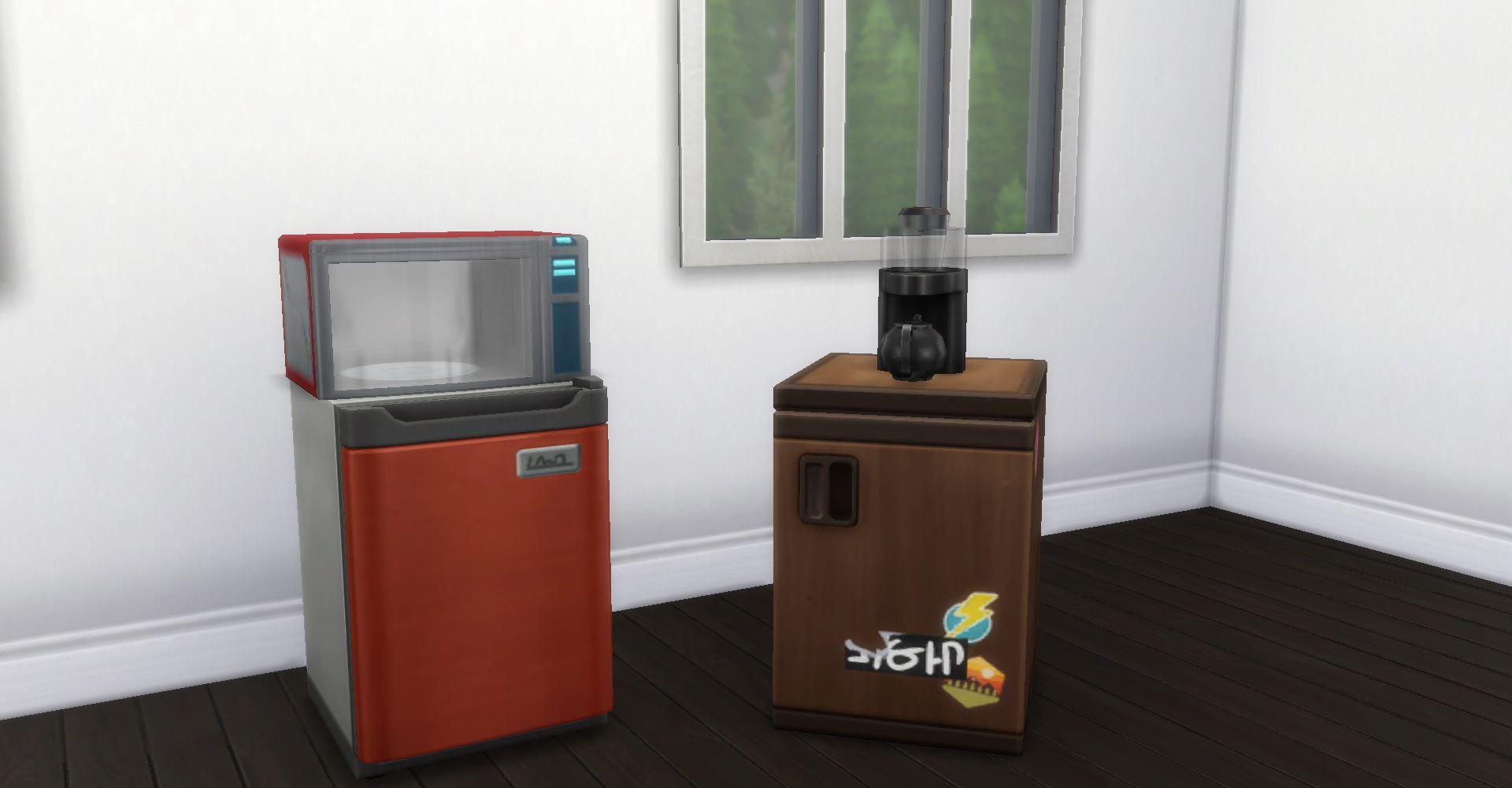 Они просто находка! Впервые появившиеся в дополнении «В университете», мини-холодильники выполняют те же функции, что и стандартные, но занимают меньше места. К тому же они могут служить импровизированным столиком, на котором можно разместить, например, микроволновку, кофеварку или чайник (или создать живописный беспорядок). Сочетание мини-холодильника и микроволновой печи позволяет симам питаться готовой едой без необходимости учиться готовить. Другими словами, кулинарные навыки не понадобятся.