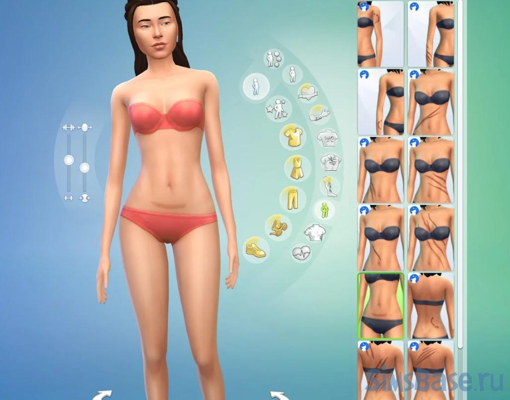 В разделе «Тело» CAS появилась новая категория — «Шрамы на теле »! В эту категорию теперь входит шрам от кесарева сечения. Однако если у вас установлено расширение The Sims 4 Оборотни, вы также сможете увидеть шрамы от когтей.