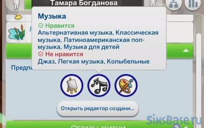 В CAS вы заметите, что от чуть ниже иконки Жизненной цели ответвляется «новая молекула». Это ваши симпатии и антипатии. Щелкните её, чтобы открыть меню, в котором вы можете выбрать одну из трех различных категорий: цвет, музыкальный жанр и увлечения.