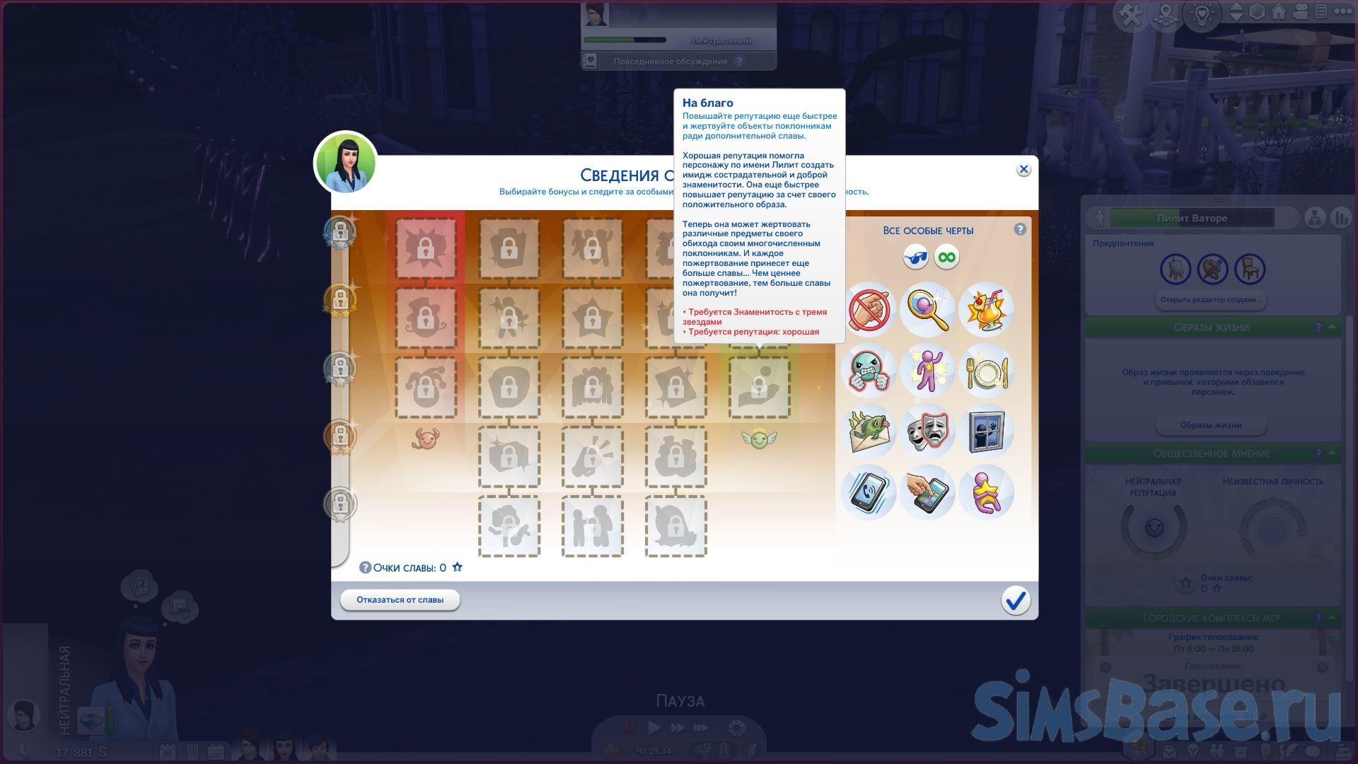 - На благо – Симы с трехзвездочным уровнем славы и хорошей репутацией могут использовать этот перк, чтобы заработать славу, жертвуя личные предметы домашнего обихода. Чем ценнее объект, тем больше он получает известности.