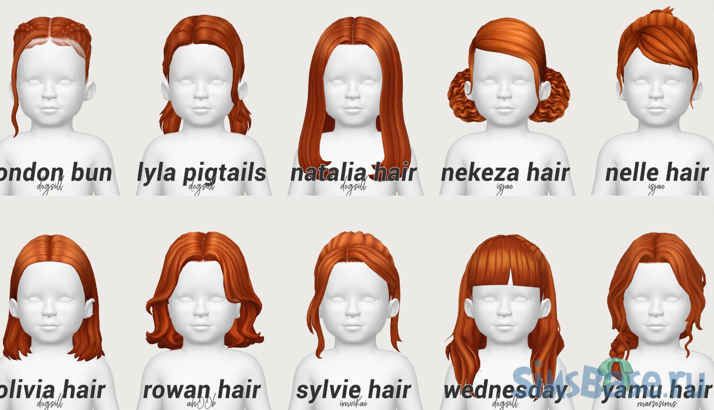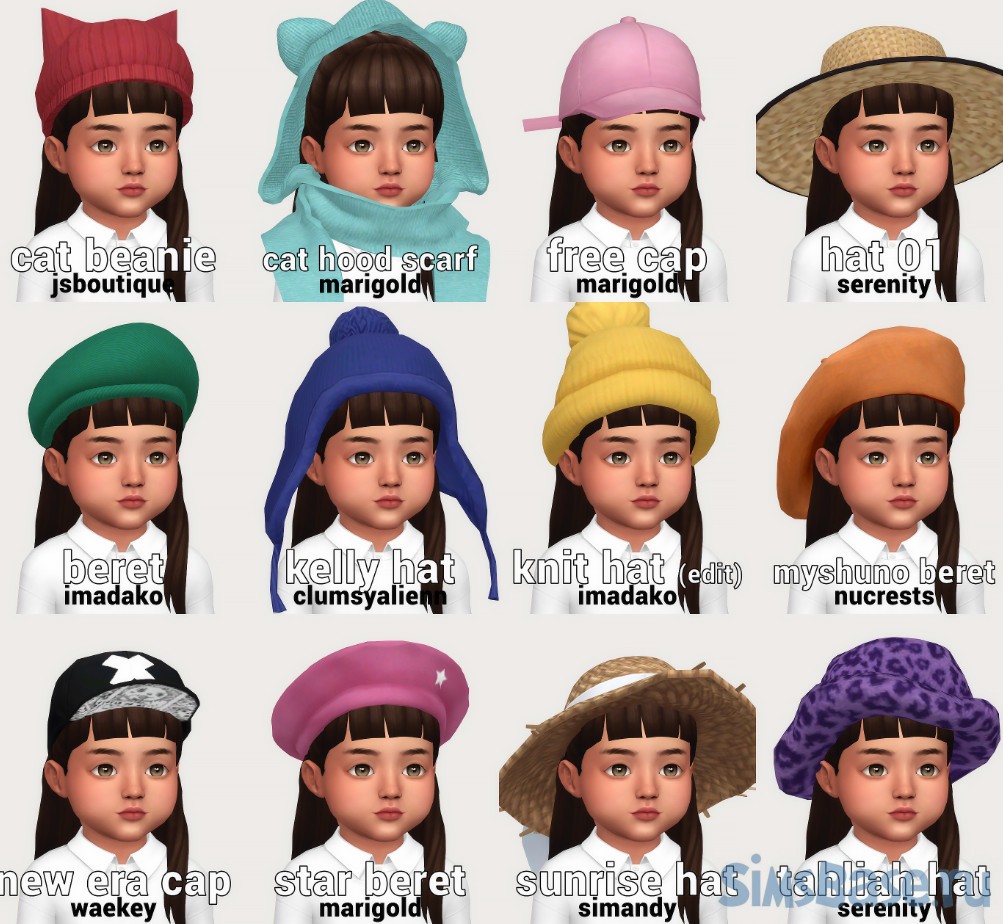 Набор включает в себя прически и головные уборы для малышей (тоддлеров). Все прически подходят как мальчикам, так и девочкам. Особенность причесок – несовместимость с головными уборами (любыми). Также имеется коллекция шляп и шапок для малышей. Вы найдете береты, кепки, соломенные шляпки и многое другое. Все предметы имеют множественные окрасы, текстуры и рисунки.