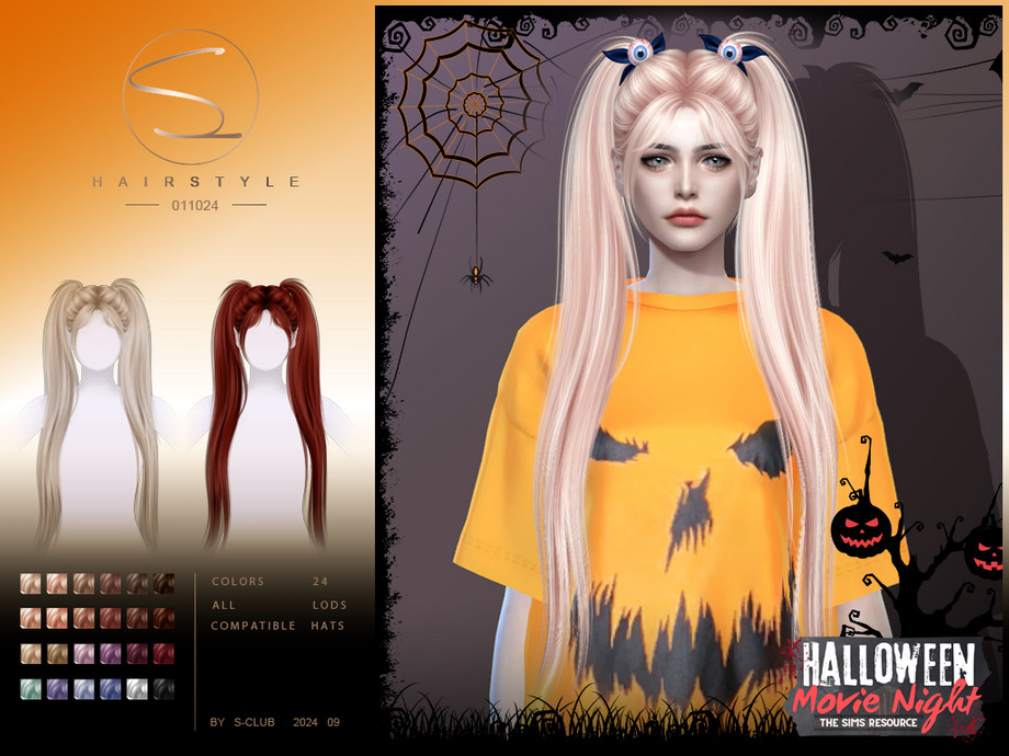 Вот стильная причёска двойные хвостики от известного создателя S-Club, специально выпущенная к Хэллоуину 2024 года! Эта милые и игривые двойные понытейлы идеально подойдут для молодых симок, которые любят яркие, задорные образы с ноткой праздничной магии.