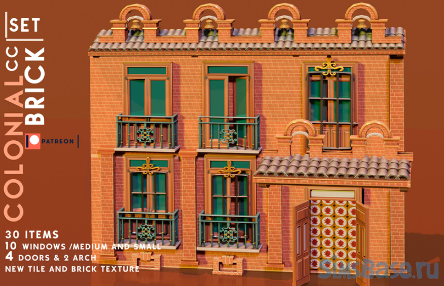 Автор создает предметы для строительства в очень высоком качестве, поэтому наборов в подборке не много, но и размер существенный. Предметы колониального стиля из кирпича: стены, текстуры, витые железные балконы, стулья, двери, решетки на окна и прочее. Набор включает 30 предметов и разного размера окна.