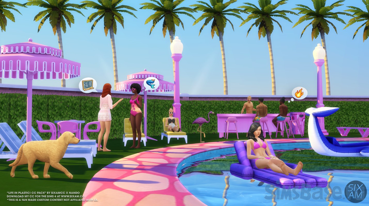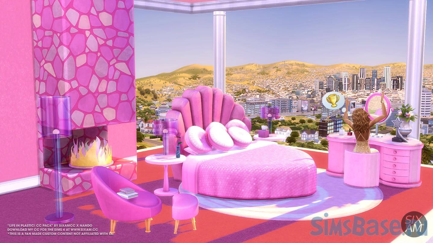 Продолжая тему Барби… Представляем набор CC «Жизнь в пластике», вдохновленную фильмом о Барби. Приготовьтесь перенести своих персонажей в царство гламура, веселья и розовой мебели! От элегантной кровати в форме сердца со сверкающими простынями до роскошного камина, подходящего для дома принцессы, каждый предмет излучает сказочный шарм, который заставит ваших персонажей почувствовать себя так, как будто они живут в своей собственной стране Барбиленд! Среди предметов кресла, кровати, подушки, столы, зонтики. Зеркала, торшеры, светильники, ведра и много дргугое. Кроме того, мебель может быть не только розовой.