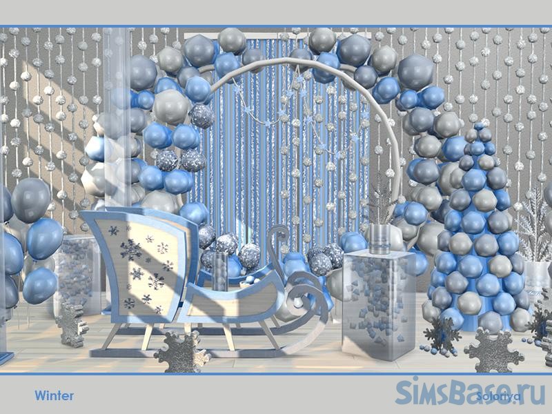 Зимний комплект для любых комнат. Включает 11 предметов, имеет 2 цветовые палитры. В наборе можно найти стол, воздушные шары, шторы, снежинки, санки, колонны, елки и многое другое.