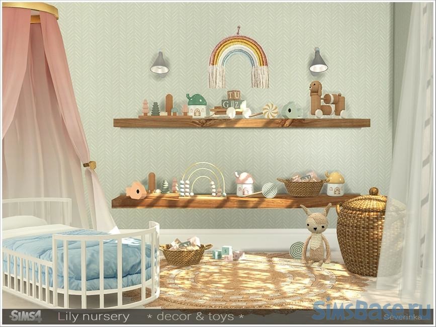Набор декора подходит оформления детской комнаты. В коллекции найдутся счеты, корзинки с кубиками, домики, рыбки, радуги, кролики, лес и другие предметы. Их можно размещать на полках, тумбочках и иных поверхностях.