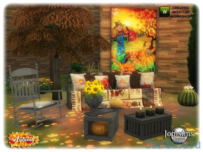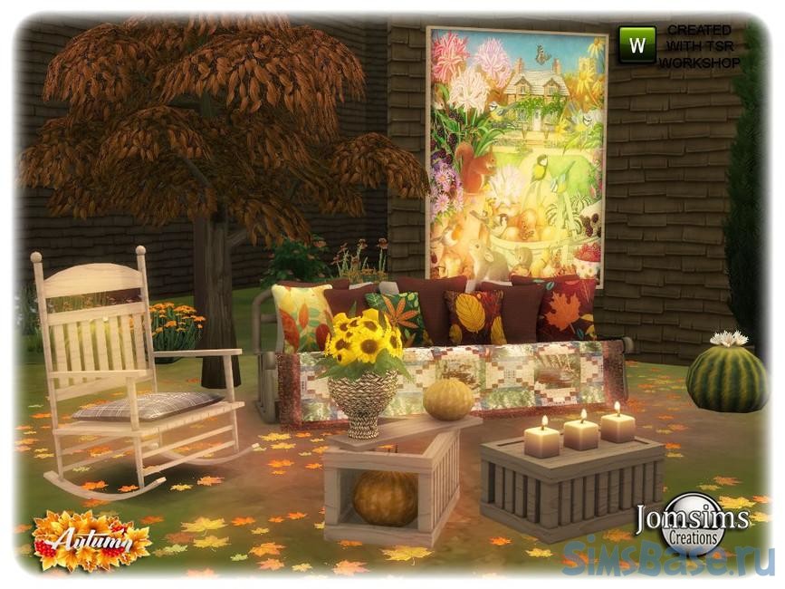 Набор осенней мебели, выдержанной в теплых тонах, ярких расцветках, но так эффектно передающих тематику осени. В наборе есть диван, подушки, кресло-качалка, подсолнухи, картины, столик, ящик с тыквами, дерево и многое другое.