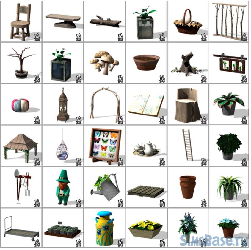 Коллекция включает в себя 36 предметов для сада. Среди них беседки, гномы, тележки, арки, корзинки и прочие предметы, без которых обустроить придомовую территорию сложно, а если симы занимаются фермерством, то и тем более. Все предметы имеют высокое качество визуализации, не требуют расширений. Особенность набора – предметы конвертированы из Sims 2 и Sims 3, поэтому фанаты этих версий быстро их узнают.