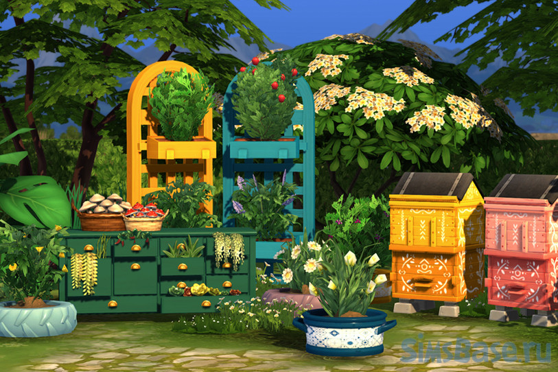Коллекция включает огромное множество разных предметов декора для сада, огорода, двора. Классические деревянные рейки и подушки из мешковины создают идеальную точку обзора, чтобы наблюдать за переворачивающимися и падающими листьями осенью. Бочки, полные мумиё, клен в горшке и столик как раз подходящей высоты для вашего летнего чаепития. Также вы найдете пчелиные ящики, два небольших горшка и функциональную вертикальную решетку, корзину, полную грибов, и комод, набитый растениями. Красочные цветы и бобы придают уют вашему самому освежающему садовому пространству. Нежные пчелы продаются отдельно.