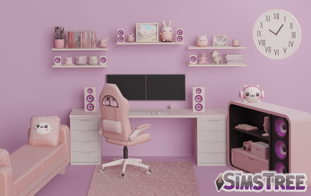 В комплекте — всё для стильного сетапа: удобный стол с двойными мониторами, где ваш сим сможет часами кодить или стримить, пушистое игровое кресло для максимального комфорта, полки для фигурок и гаджетов, диванчик для перерывов и даже ковёр, шторы и часы в пастельных тонах. Не забудьте про наушники, колонки и подставку — всё в шести вариантах оттенков, от нежного розового до лавандового, чтобы подстроить под ваш вкус.