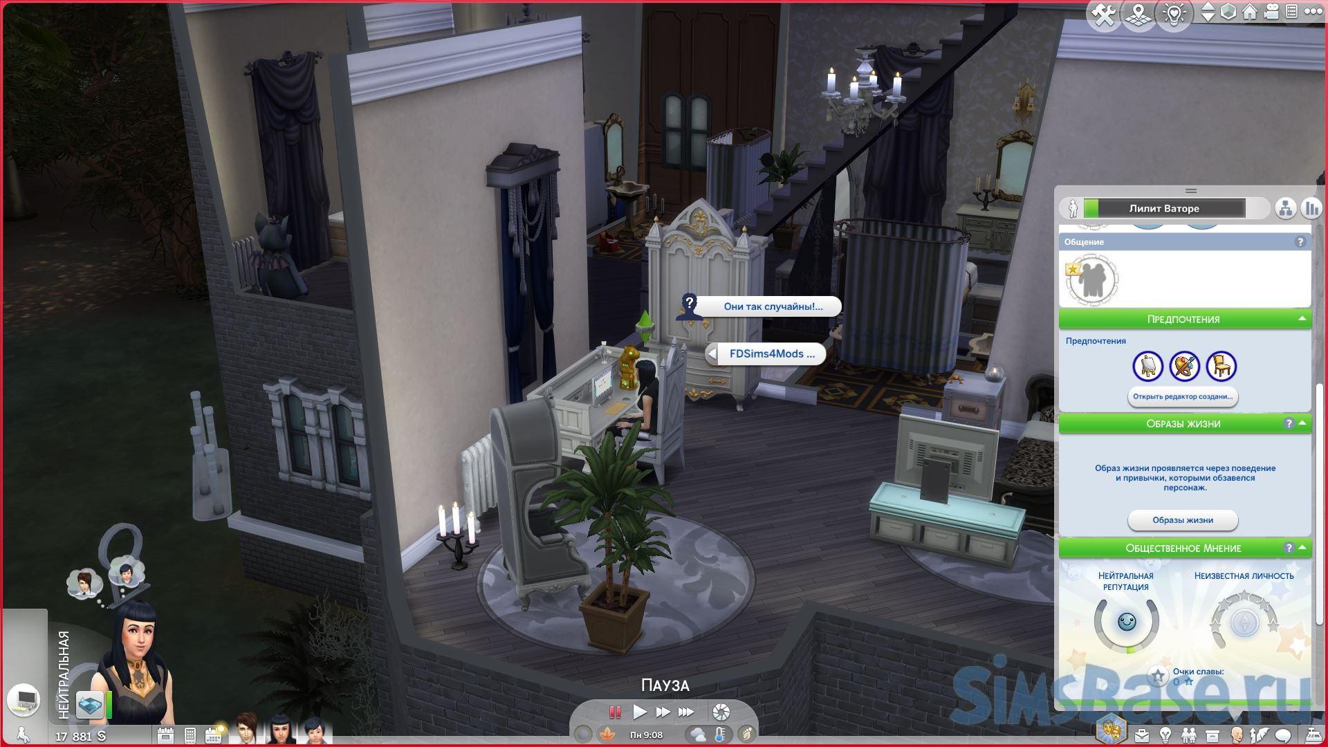 Вы можете отключить уведомления с вопросами о предпочтениях для играемого сима по отдельности. Для этого нажмите на сима, которого вы хотите, удерживая Shift (после использования тестовых читов), найдите меню FDSims4Mods и перейдите в подменю этого мода .