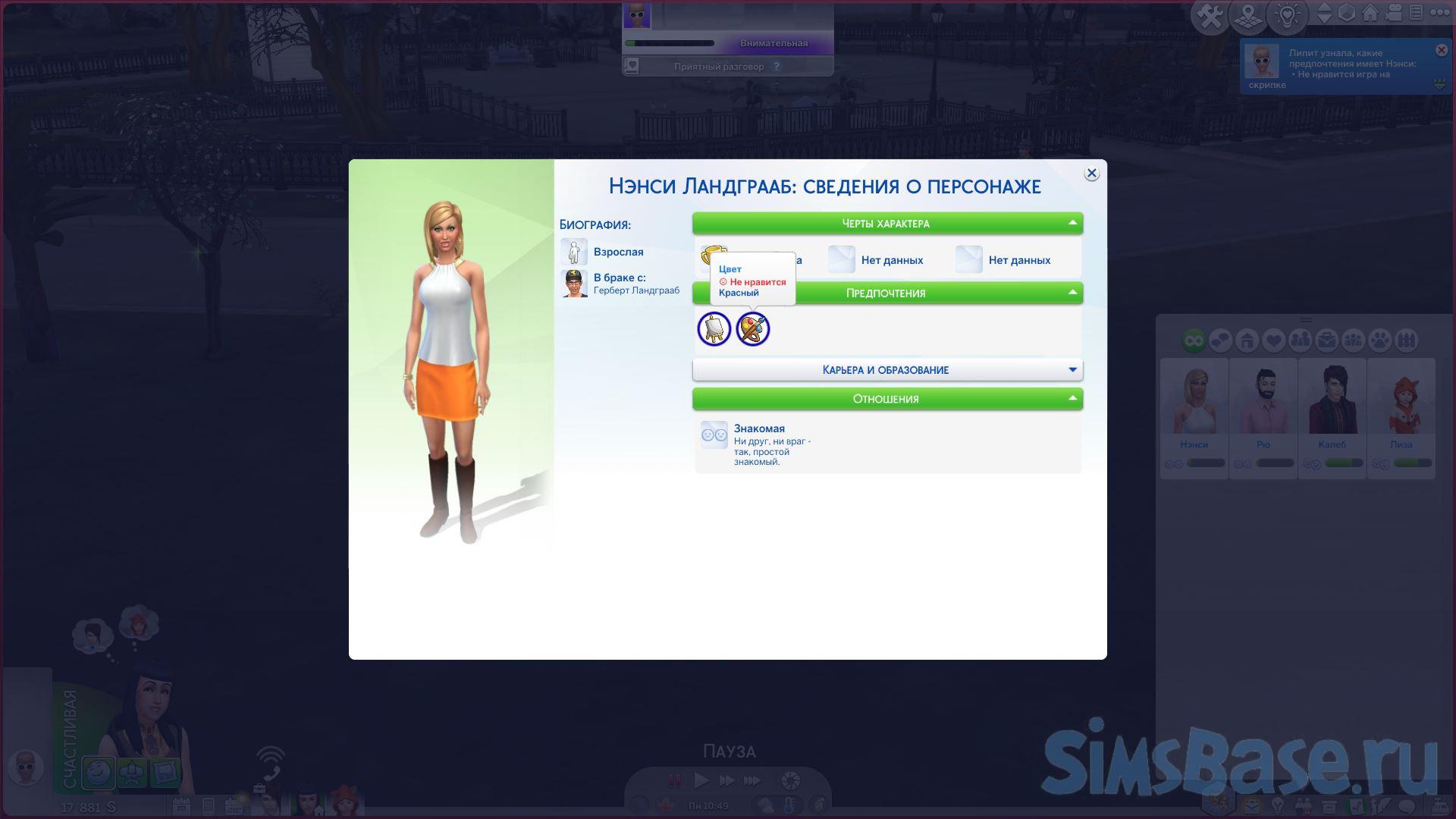 Важно: Предпочтения не даются сразу. Должно пройти некоторое сим-время. Если вы устанавливаете для играемого сима конкретное/случайное предпочтение, оно будет заметно, если для неиграемого, то сима еще предстоит узнать через общение, чтобы данная информация отобразилась в профиле или перезайти за него, чтобы увидеть результат.
