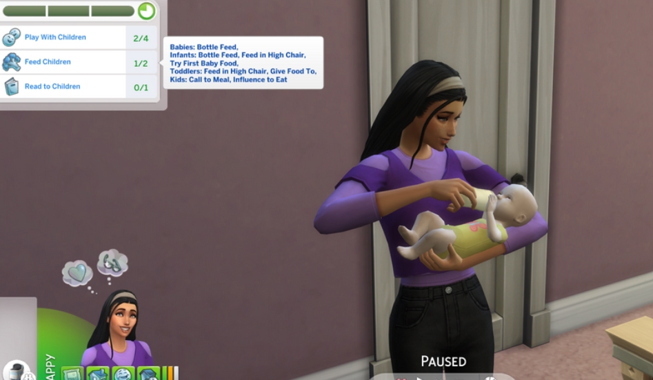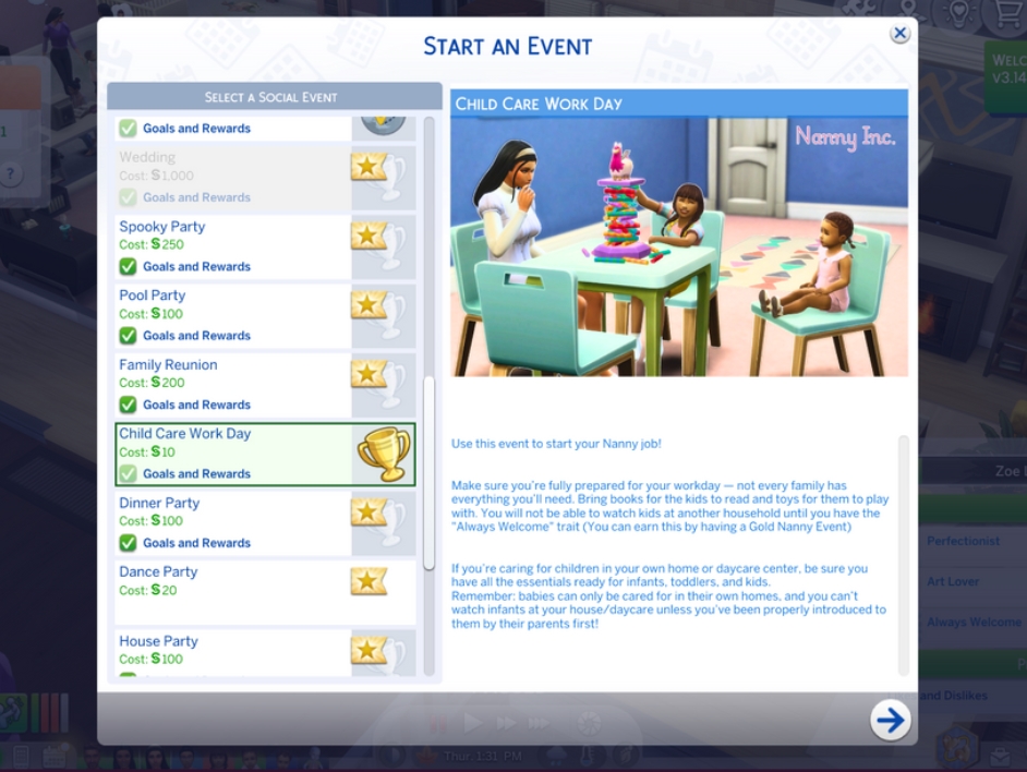 Работайте на дому или выезжайте к клиентам (малышей можно брать только в их родном доме, после знакомства с семьёй). Начинайте смену через событие «Рабочий день по уходу за детьми» или планируйте заранее в календаре. Выполняйте задания, получайте деньги и баффы в зависимости от качества работы. Заработайте золотую оценку — и откроете черту «Всегда желанный гость», чтобы спокойно работать в чужих домах без риска быть выставленным за дверь.