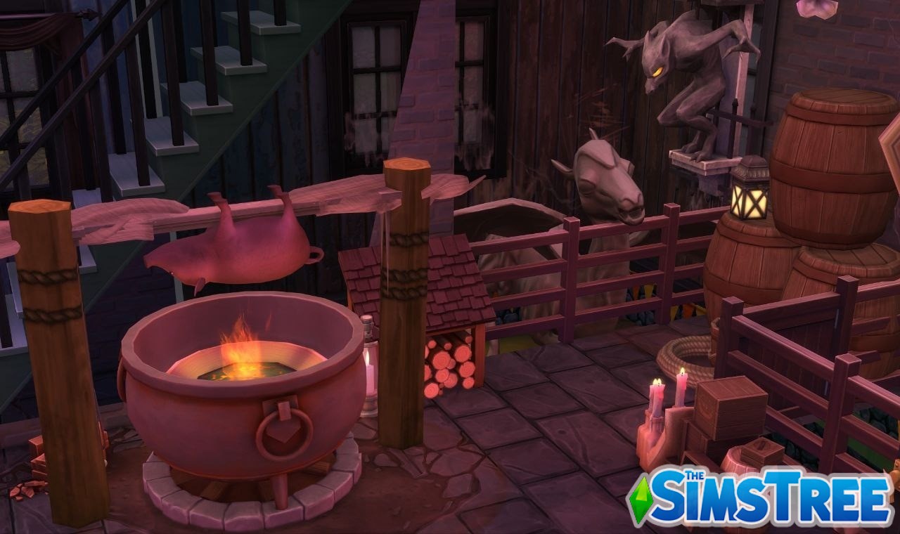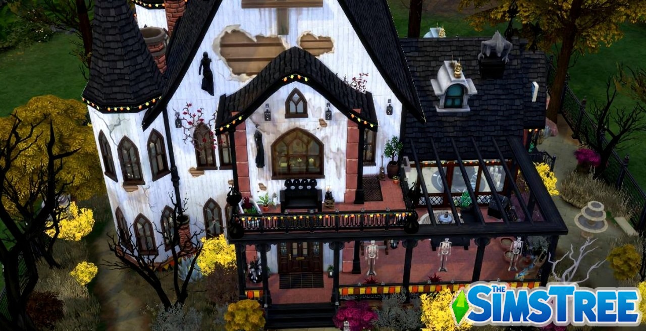 Второй вариант — «Тёмный Ковен» от WitchyBuilds: трёхэтажный замок на 30×20, 4 спальни, 3 ванные. Массивные башни, подземелье с полками для книг заклинаний и оранжерея с редкими травами. Симы-ведьмы будут чувствовать себя королевами тьмы!