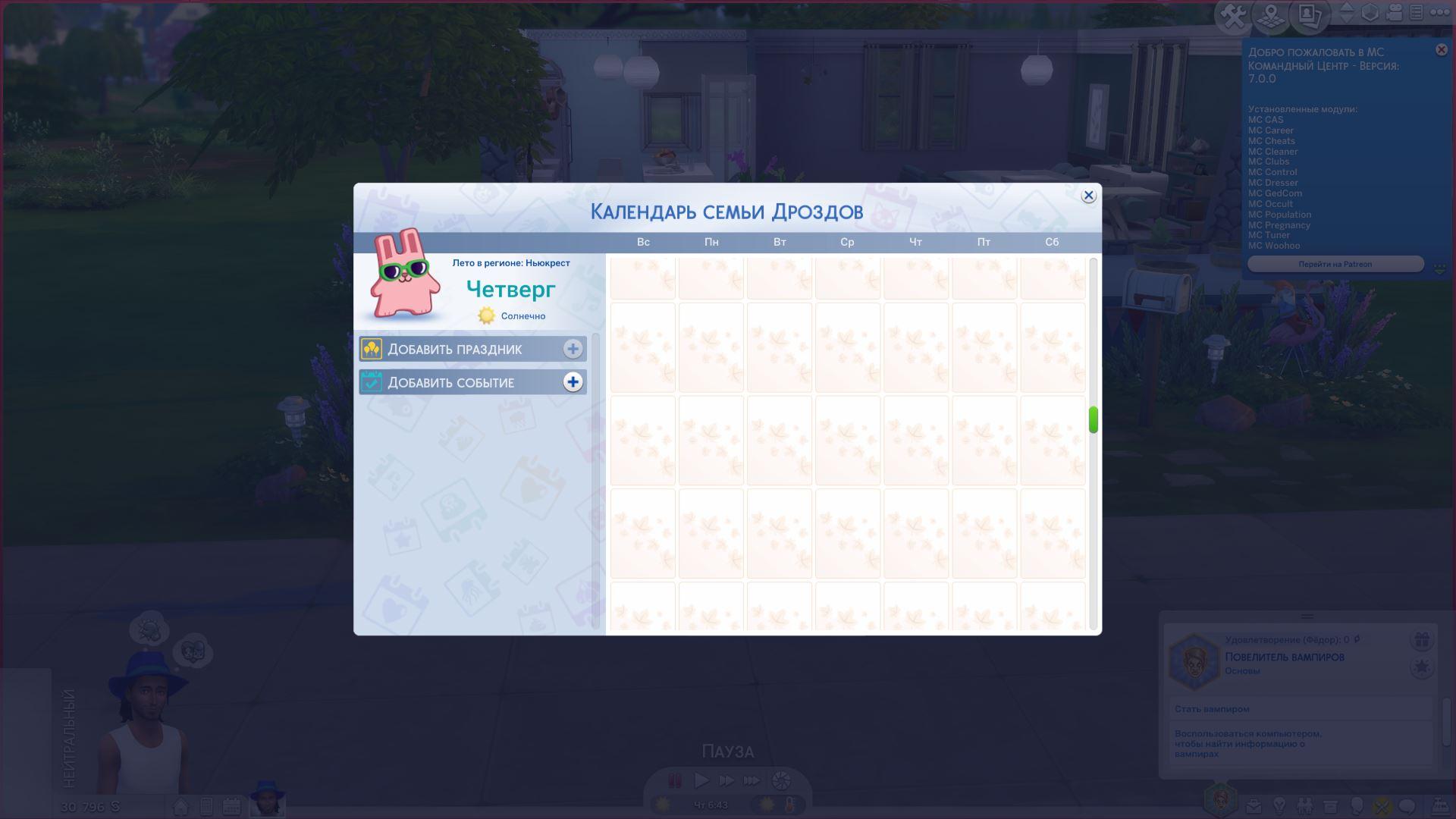 Кроме этого, календарь становится пустым. Праздников нет. Кроме тех, что вы успели добавить сами или уже есть в текущем месяце. Но уже в остальные сезоны все дни будут пустыми, и вы сможете сами настроить мероприятия при желании.