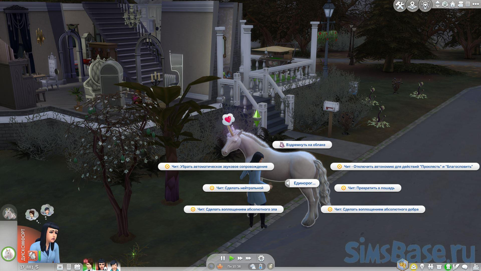 Единорогов можно создать, создав лошадь в CAS и используя *чит в игре с включенным testingcheats, чтобы сделать их официальным «единорогом». В этот мод включено несколько читов для превращения лошадей в единорогов, изменения их мировоззрения и т. д. Введя «testingcheats true» в консоль читов и нажав клавишу Shift+щелкнув лошадь/единорога, вы увидите всплывающее круговое меню «Единорог».
