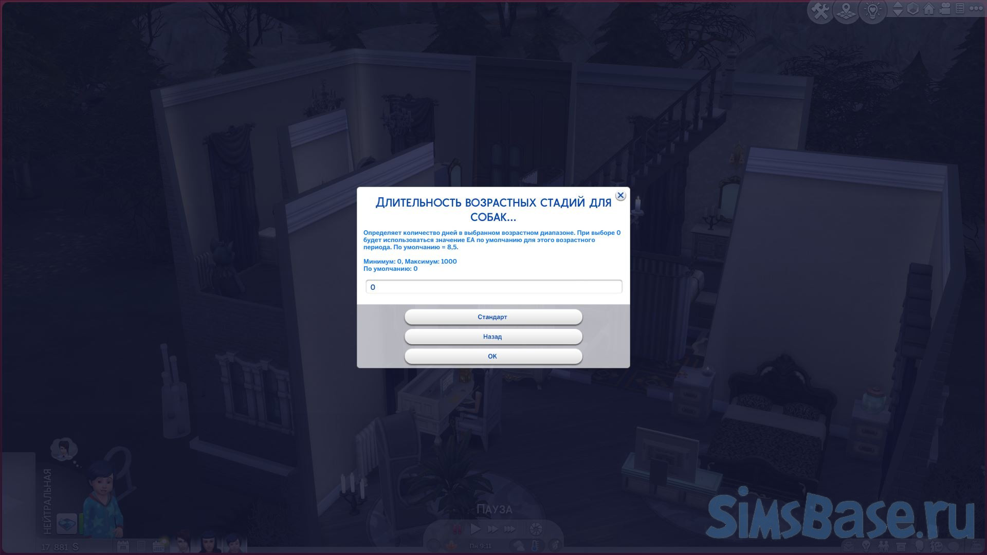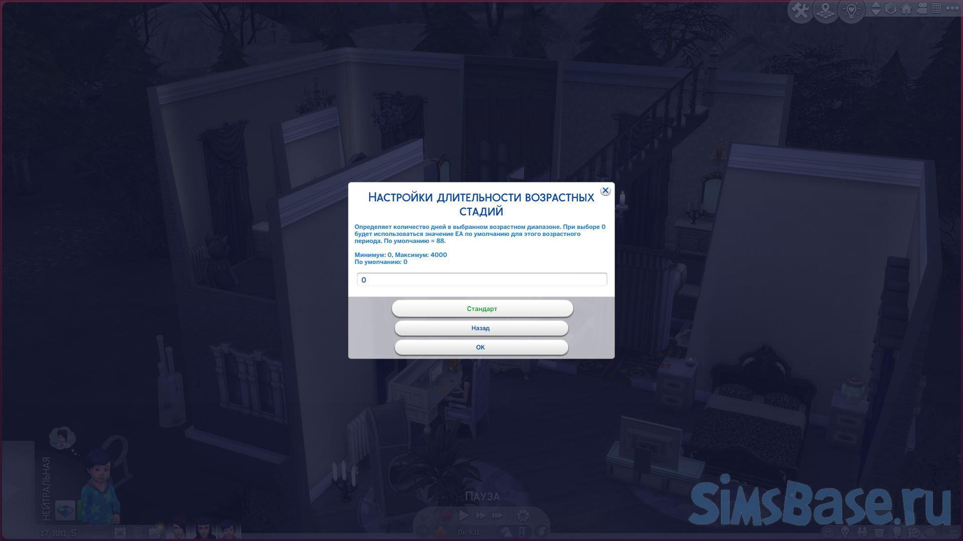 Увеличено максимальное количество дней в любом периоде возраста сима до 4000. Перед изменением возрастного диапазона расширения Старшая школа игроки могли установить максимальный возрастной диапазон в обычном режиме для любого возраста до 1000. Для долгой жизни это превратилось бы в 4000, поскольку использовалось в 4 раза больше обычного значения возрастного периода. Чтобы дать игрокам одинаковую максимальную продолжительность, автор установил максимальное значение для всех возрастных диапазонов на 4000. По сути, это означает, что если кто-то хочет иметь 4000 дней в Молодом возрасте, он может сделать это и в нормальных настройках сейчас, и вообще не будет необходимости переходить на Длительную продолжительность в настройках игры.