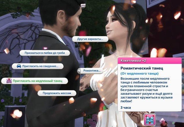 Возможность медленно танцевать появляется в романтическом взаимодействии – «Пригласить на медленный танец» – если между симами уже есть романтические отношения. При дружеских отношениях этот вариант в меню доступен не будет.