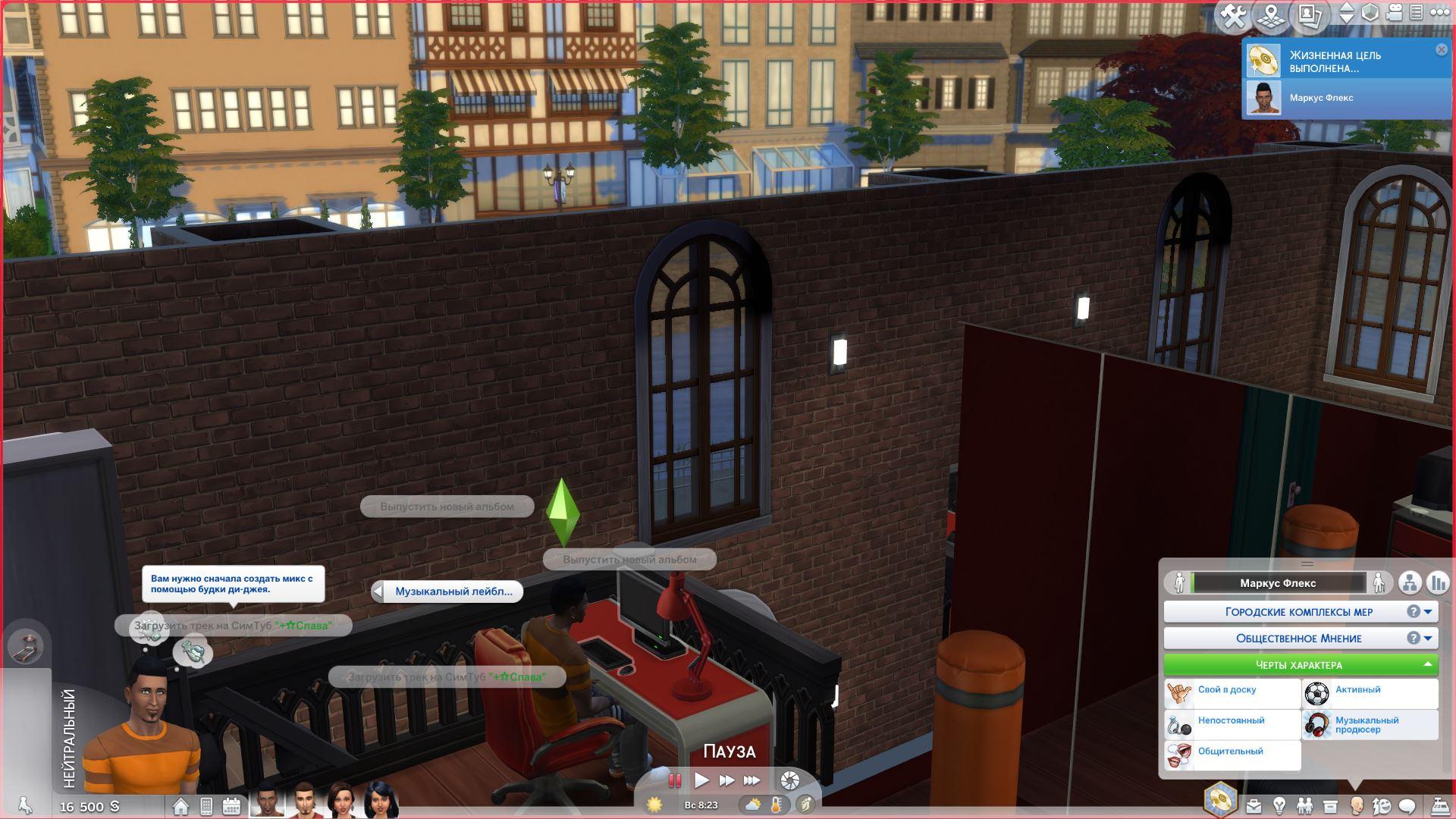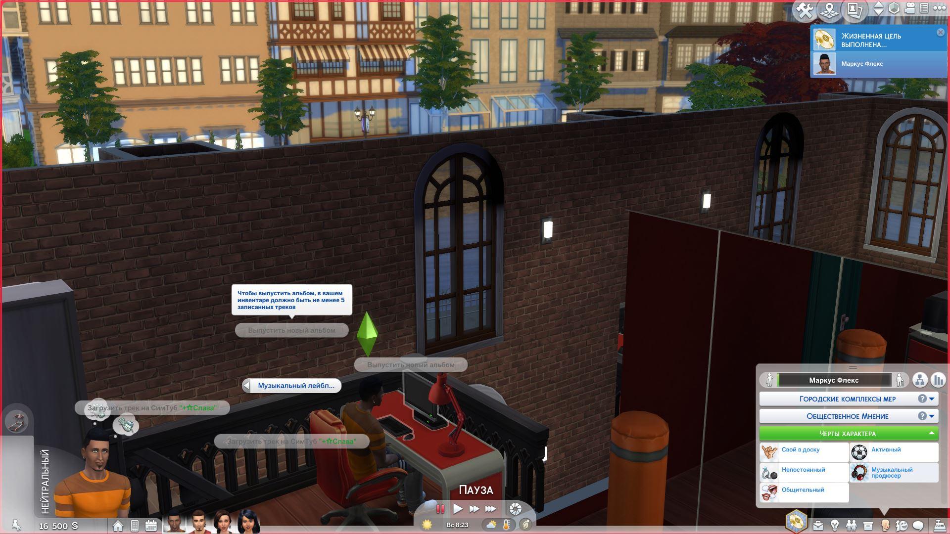 После завершения ЖЦ на РС появится новое действие Музыкальный лейбл. Если по нему кликнуть, то сим сможет: загружать музыку на СимТуб, выпускать альбом с 5-ю треками, которые вы сочините либо в будке ди-джея, либо на музыкальной станции. Касательно музыка на СимТубе, то тоже 2 варианта, в зависимости от варианта записи.