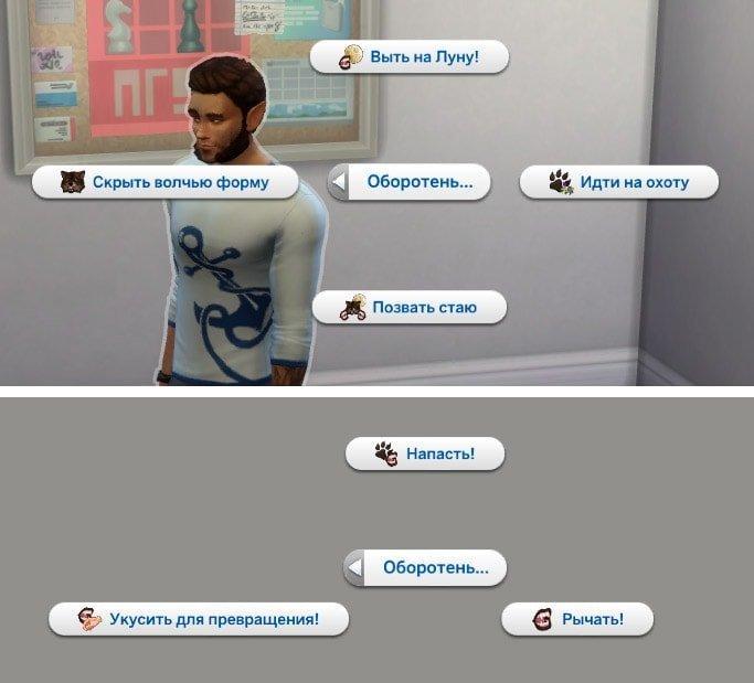 В трансформированном виде персонаж получает возможность пользоваться взаимодействиями из меню “Оборотень” при нажатии на других персонажей .