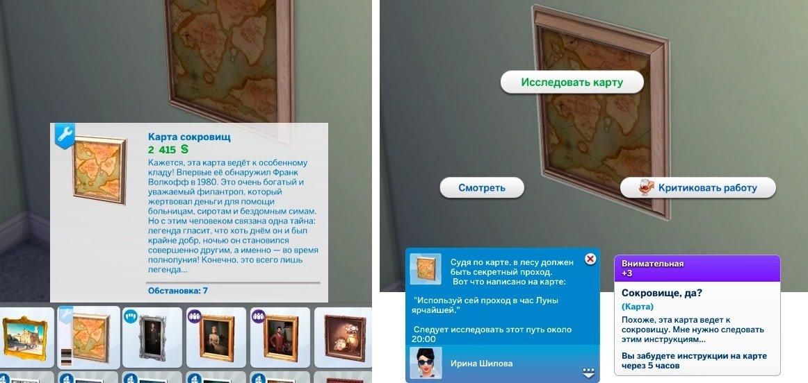 - Переходите в режим строительства и в каталоге ищите “Карту сокровищ”. Вещаете ее на стену и отправляете сима взаимодействовать с ней. Нужно выбрать вариант “исследовать карту”. После этого в период с 20:00 до 5:30 при вызове меню на персонаже, появляется пункт «Исследовать темные лесные чащи». Сим отправится один (аналогично с похищением пришельцем или походом на работу). А после возвращения окажется укушенным волком. Спустя пару дней, может раньше, персонаж превратится в оборотня.